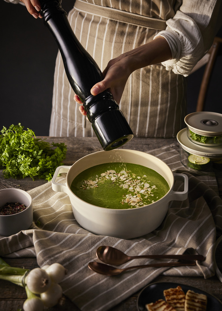 - Przelej zupę do blendera kielichowego DUKA BOSSE, dodaj posiekaną kolendrę, sok z cytryny oraz pokruszoną fetę, dopraw solą i pieprzem. Zmiksuj do powstania gładkiej zupy krem.